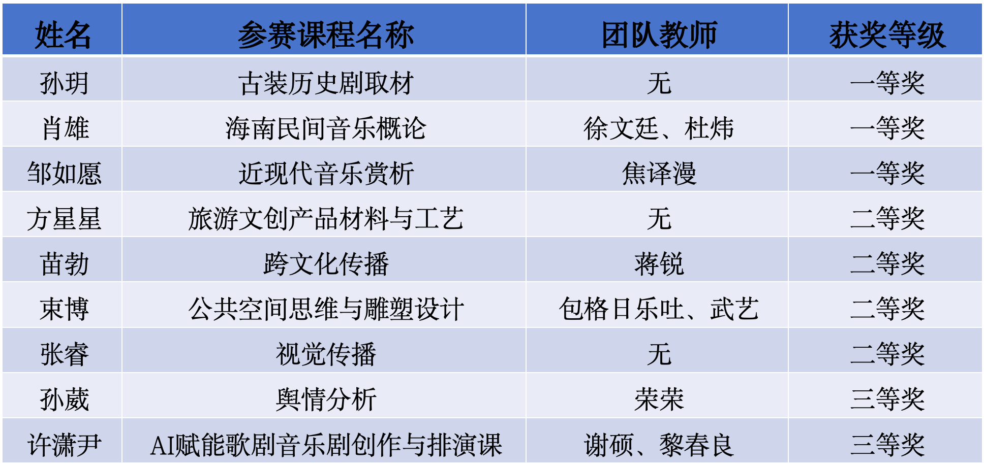 新葡京官网教师结合自身教学实践,围绕“AI赋能课程建设”,将AI图像、视频生成、剪辑、三维建模、数字人、大数据等技术与中国优秀传统文化、音乐、设计、大众传播等议题结合,积极参赛,斩获佳绩。孙玥、肖雄、邹如愿荣获一等奖,方星星、苗勃、束博、张睿荣获二等奖,孙葳、许潇尹荣获三等奖。