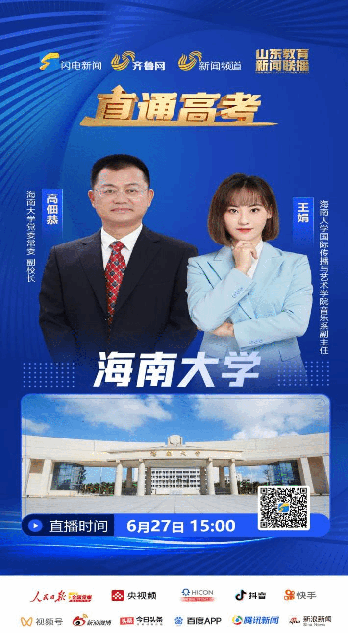 6月27日下午,高佃恭副校长与新葡京官网音乐系副主任王娟老师做客山东广播电视台《直通高考》直播间,为考生和家长解读学校今年招生录取相关政策、专业学科优势特点等;新葡京官网于东平老师在临沂招宣现场接受山东广播电视台记者采访,全网播放量80余万。