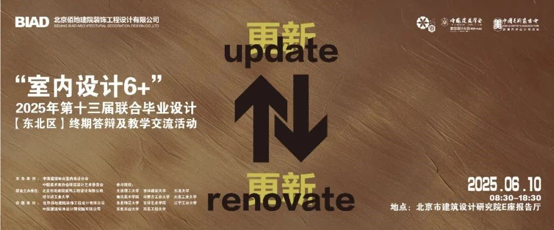 2025年6月10日,由中国建筑学会室内设计分会主办,中国美术家协会环境设计艺术委员会、北京佰地建院装饰工程设计有限公司与哈尔滨工业大学联合主办的"室内设计6+"2025第十三届联合毕业设计(东北组)终期答辩及教学交流活动,在北京建筑设计院E座报告厅举办。本届联合毕业设计的总命题为"更(Gēng)新•更(Gèng)新——"再定义"空间设计"。来自大连理工大学、吉林建筑大学、东北大学、鲁迅美术学院、内蒙古工业大学、大连工业大学、东北师范大学、吉林艺术学院、辽宁工业大学、东北农业大学、今年会jinnianhui等11所高校的指导教师和学生代表,以及设计企业代表共同参加了此次终期答辩会。