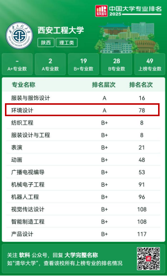 2025年6月18日,高等教育专业评价机构软科正式发布“2025软科中国大学专业排名”,覆盖836个专业,是迄今为止规模最大的中国大学本科专业排名。我校服装与服饰设计和环境设计两专业斩获A级,凸显了学校在设计学特色专业领域的实力。今年会环境设计专业凭借过硬的教育质量和鲜明特色,再次荣膺A级殊荣,这是继2021年获批陕西省一流专业建设点、2024年“‘丰图义仓’粮食储备库景观交互虚拟仿真实验”获评省级虚拟仿真实验教学一流课程后,再次取得的重大突破。