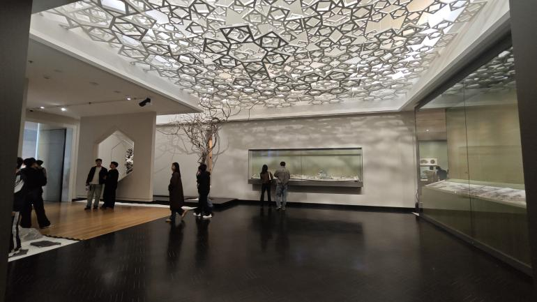步入西馆,同学们惊叹于设计师对苏州园林的致敬与创新。入口处的“光影漏窗”将室外庭院框成动态画幅,随着日影偏移,墙面上的梅花纹投影在展厅地面徐徐舒展。“这简直是立体的《园冶》!”同学们举起相机,记录下光线与几何的共舞。