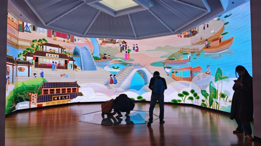在“吴中风雅”展厅,太湖石被悬置于透明玻璃匣中,下方投影模拟水波荡漾,虚实之间再现了“石令人古,水令人远”的意境。同学们驻足分析:“传统赏石从园林移入室内,通过科技手段保留了‘移步换景’的观赏逻辑。”更令众人称绝的是“园林长廊”展区——设计师以金属网重构廊架,穿插电子屏播放四时园景,游走其间,仿佛穿梭于现实与虚拟交织的沧浪亭。