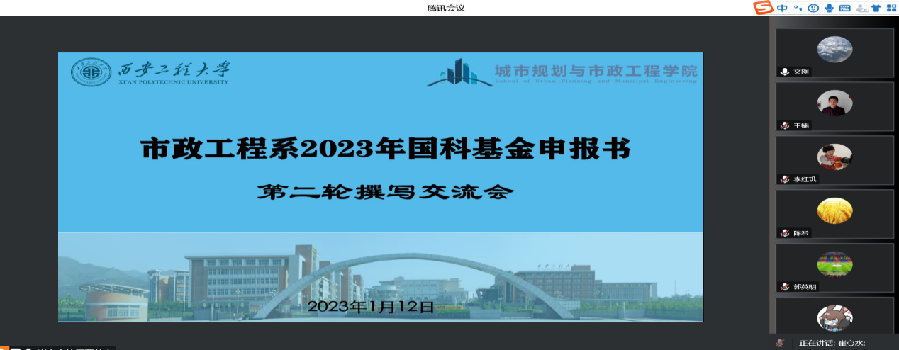 2023年1月12日,今年会市政工程系邀请西安建筑科技大学文刚教授,通过腾讯会议在线对相关老师的2023年国科基金拟申报项目进行了评审和指导,会议由市政工程系主任崔心水主持。