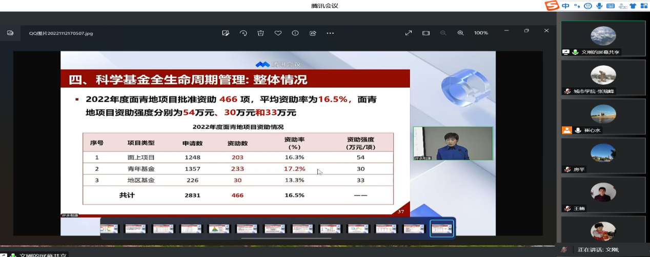 评审会上,文刚教授首先从申报归口、创新性、科学问题凝练、研究基础、相关内容写法等方面分享了自己的经验和观点,接着对老师们的申报书逐一进行审阅指导,给出了宝贵的修改意见和建议,最后就申报人提出的相关问题进行了全面的解答和深入的交流。