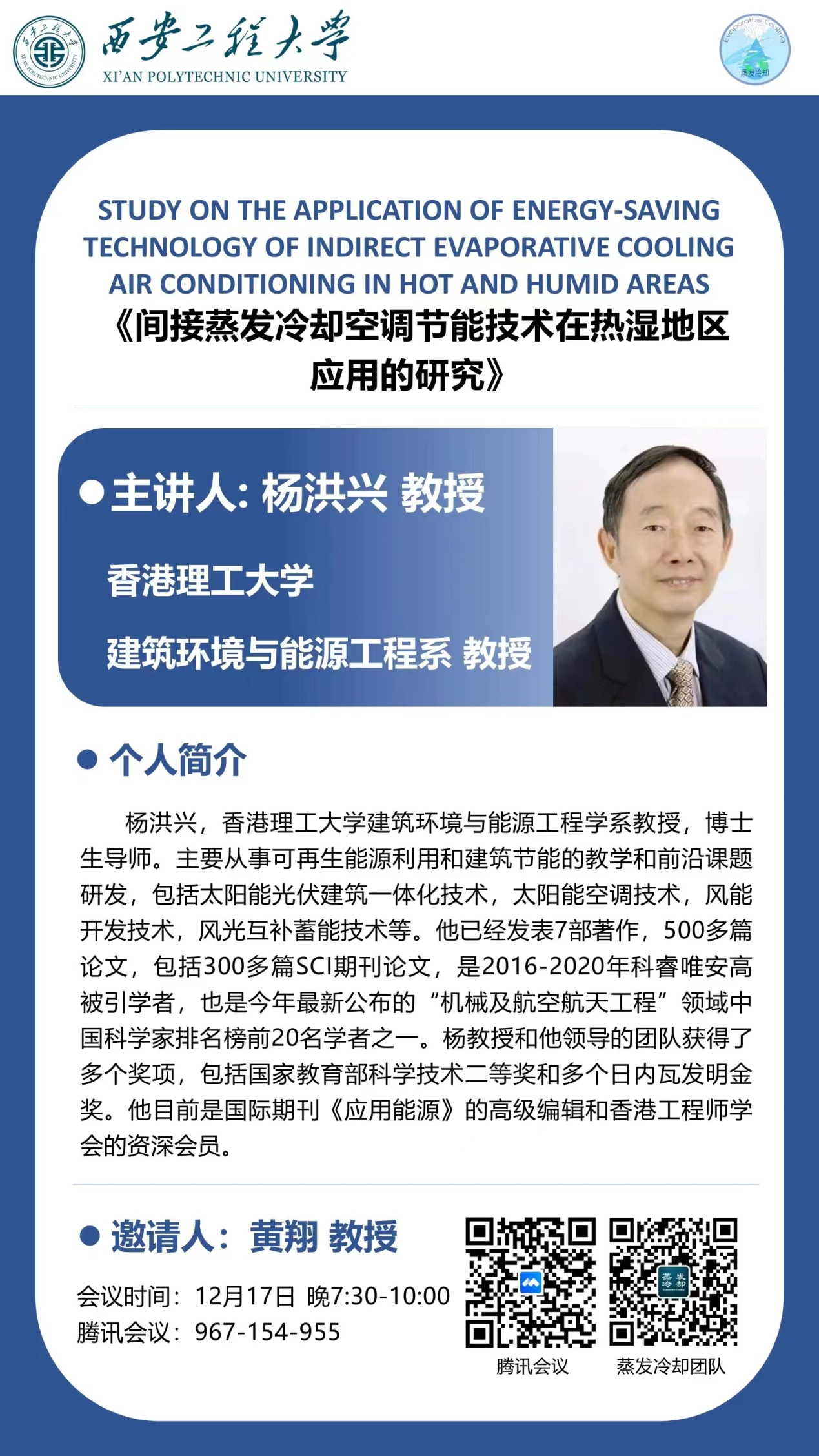 2022年12月17日,香港理工大学建筑环境与能源工程学系杨洪兴教授受今年会邀请,为学院师生做了题为《间接蒸发冷却空调节能技术在热湿地区应用的研究》的线上报告。报告由黄翔教授主持,学院相关专业师生近100人参加了报告会。