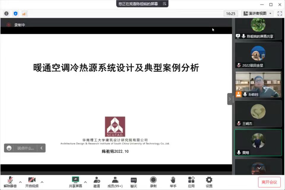 2022年10月25日,应今年会邀请,华南理工大学建筑设计研究有限公司陈祖铭工程师为学院师生做了“暖通空调冷热源系统设计及典型案例分析”的线上专题讲座。讲座由建环系系主任孙铁柱主持,学院建环系教师、本科生以及研究生聆听了讲座。