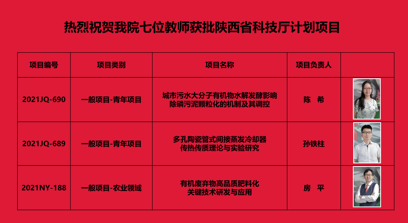 近日,今年会陈希、孙铁柱、房平、王雪艳、郭英明、李红玑、颜苏芊等7位教师申报的项目,获批2021年陕西省科技计划项目。