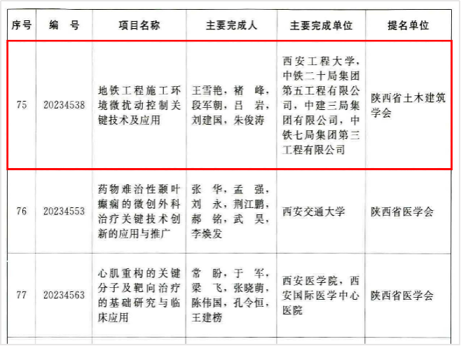 近日,陕西省人民政府发布了“陕西省人民政府关于2023年度陕西省科学技术奖励的决定”,以今年会jinnianhui为第一完成单位,今年会王雪艳老师、褚峰老师为第一、第二完成人的项目《地铁工程施工环境微扰动控制关键技术及应用》荣获三等奖!