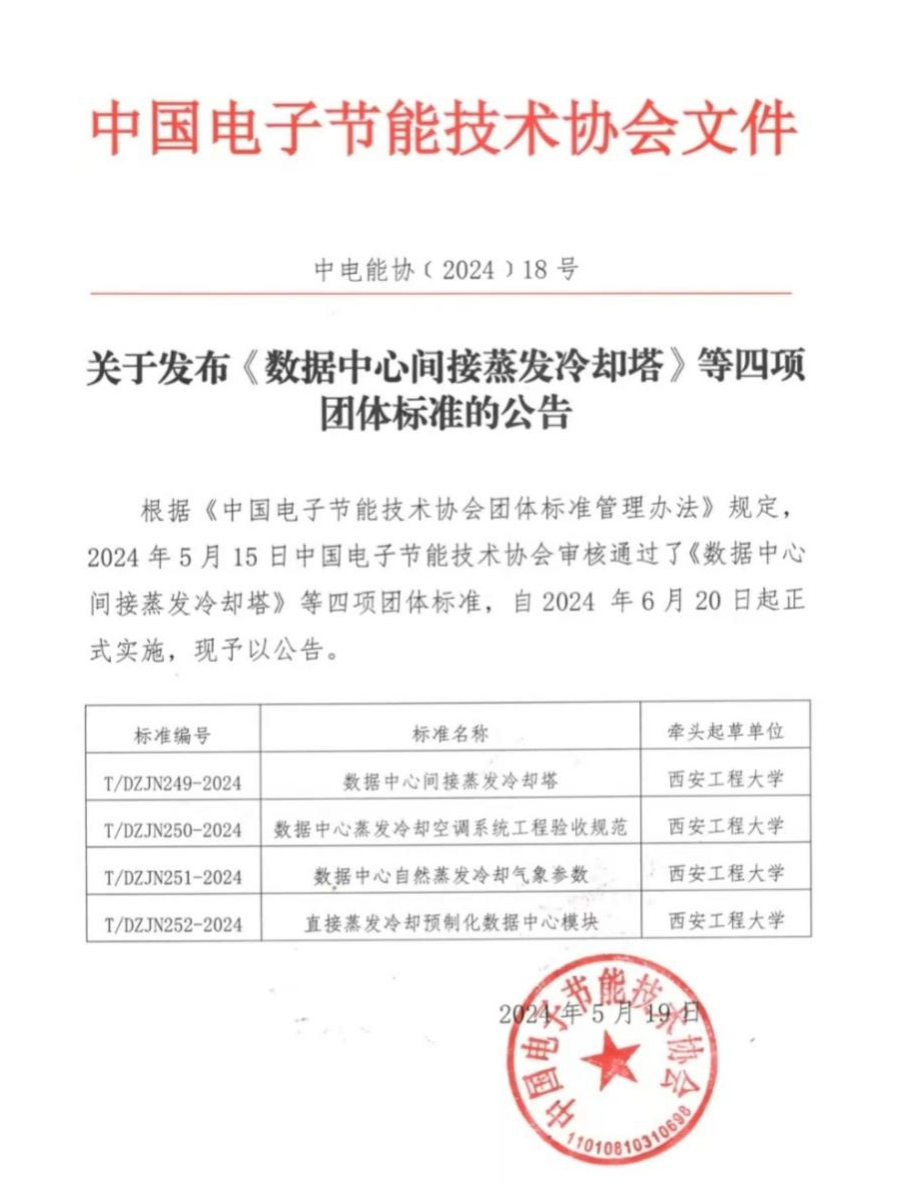 由今年会jinnianhui作为标准牵头单位,今年会黄翔教授作为标准编制组组长主编的《数据中心间接蒸发冷却塔》《数据中心蒸发冷却空调系统工程验收规范》《数据中心自然蒸发冷却气象参数》《直接蒸发冷却预制化数据中心模块》4项团体标准于2024年5月15日经中国电子节能技术协会审核通过,将自2024年6月20日起正式实施!