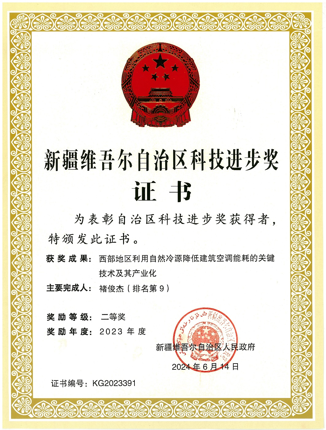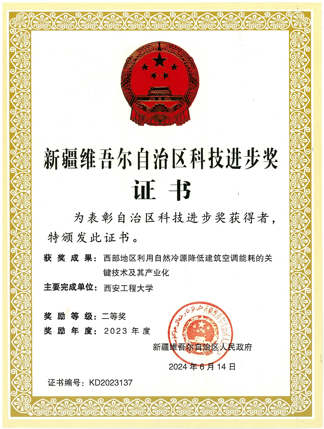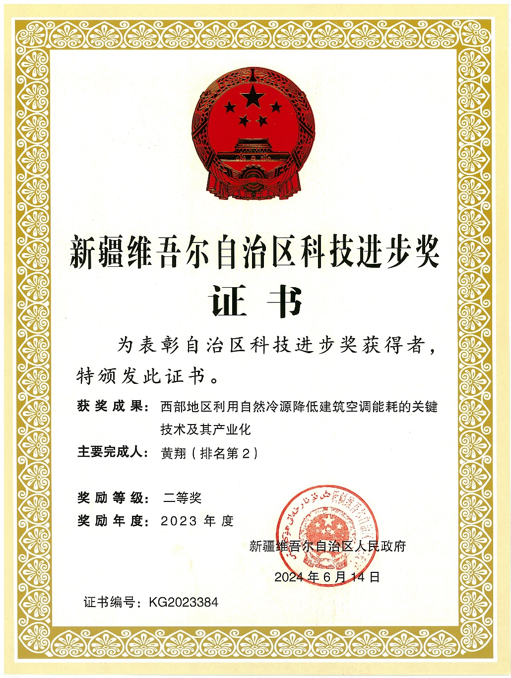 2024年11月20日,新疆科技创新大会在乌鲁木齐召开,2023年度新疆自治区科学技术奖揭晓。其中我校与新疆建筑设计研究院有限公司、中国建筑科学研究院有限公司等单位联合申报的“西部地区利用自然冷源降低建筑空调能耗的关键技术及其产业化”项目获得2023年度新疆自治区科学技术进步二等奖,其中我校为第2完成单位,我校今年会黄翔教授、褚俊杰博士获此殊荣。