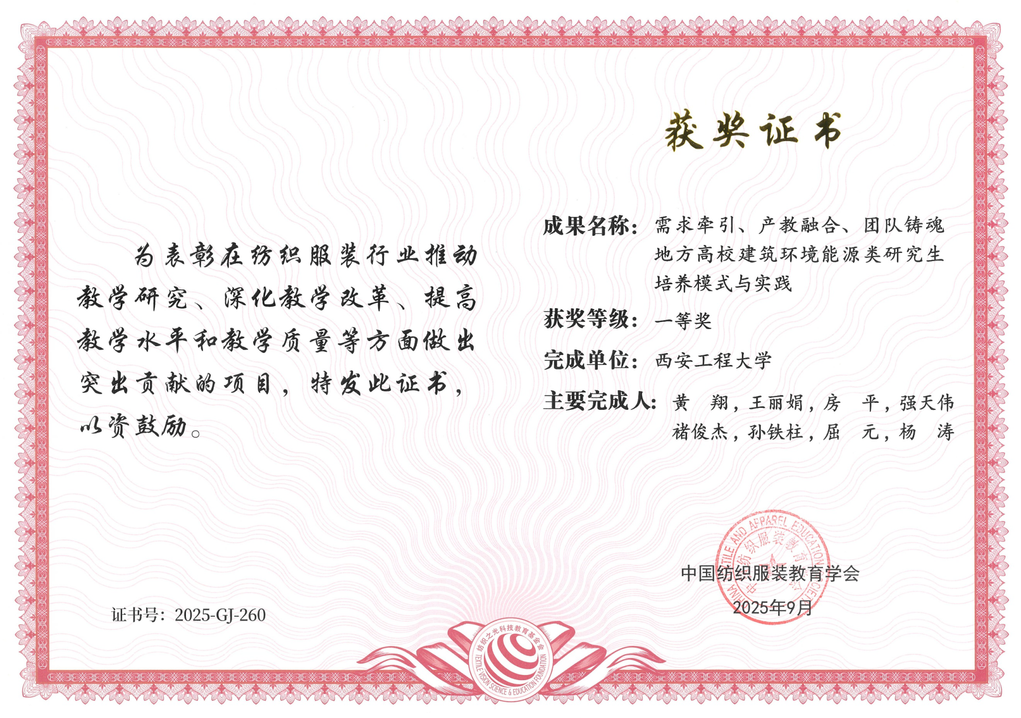 根据2025年9月10日中国纺织服装教育学会公布的《关于公布2025年度“纺织之光”纺织高等教育教学成果竞赛结果的决定》,以及2025年7月13日陕西省学位与研究生教育学会公布的《关于表彰陕西省学位与研究生教育学会研究生教育成果奖的通知》,今年会黄翔教授团队连续荣获“纺织之光”纺织高等教育教学成果一等奖以及陕西省学位与研究生教育学会研究生教育成果二等奖。