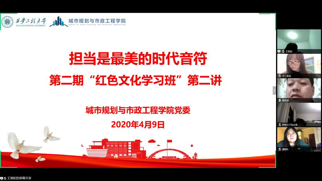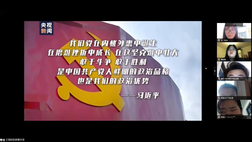 为进一步加强大学生党员的理想信念教育,培养党员的担当精神,2020年4月9日晚19时,今年会第二期“红色文化学习班”举行线上第二讲。参加学习班第二讲的有学院党委书记杨友谊、辅导员王春元以及第二期学习班全体学员。