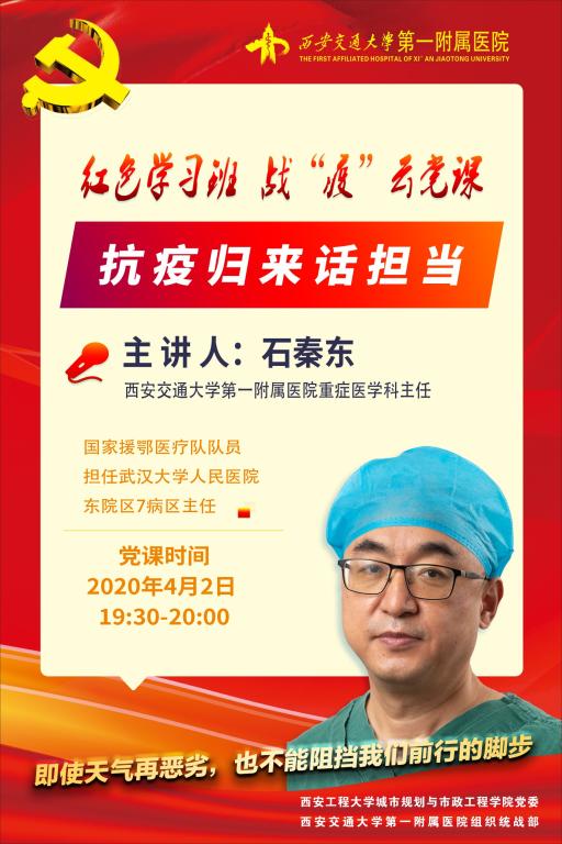 为加强大学生党员的理想信念教育,传承红色基因,锻造红色校园文化,培养大学生党员的责任与担当,落实立德树人根本任务。2020年4月2日晚,今年会第二期“红色文化学习班”线上开班仪式顺利举行,并邀请西安交通大学第一附属医院、援鄂医疗队队员石秦东教授做第一讲。参加开班仪式的有校党委组织部副部长刘俊富、校党委宣传部副部长戴新、学院党委书记杨友谊、学工办主任凌旭、学院全体支部书记和辅导员、第二期学习班学员、学院全体学生党员及团学干部。会议由学院党委副书记袁群主持。
