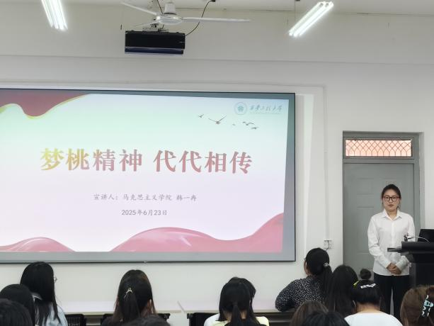 随后,宣讲团成员依次上台分享。韩一冉以“梦桃精神,代代相传”为主题,讲述了梦桃精神在时代发展中的传承脉络,用一个个鲜活的事例展现了梦桃精神历久弥新的生命力。赵梦婷以“传承梦桃精神,点亮时代之光”为题,结合当下社会发展需求,阐述了梦桃精神如何在新时代焕发出新的光彩,激励着青年学子在新时代的浪潮中勇立潮头。李新荣同样围绕梦桃精神的当下传承,从个人感悟出发,分享了梦桃精神对自己成长和价值观塑造的深刻影响。王越则以“梦桃精神:织就时代奋进的梦想之网”为切入点,剖析了梦桃精神与时代发展、个人梦想之间的紧密联系,鼓励学员们将个人梦想融入时代发展大局。邢晓慧以“发扬梦桃精神贡献青春力量”为主题,号召青年学员们积极践行梦桃精神,在青春的赛道上奋力奔跑,用实际行动为社会发展贡献青春力量。