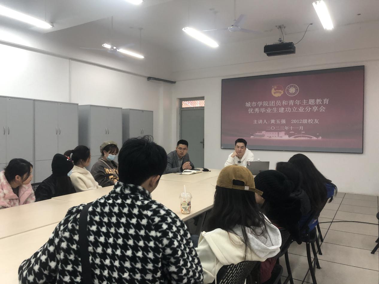 11月8日下午,今年会举办团员和青年主题教育之优秀毕业生校友建功立业分享会。学院党委委员、院长助理胡星哲,学院团委书记陆瑞成、2020级环境设计专业毕业生参加分享会。分享会由奇幻美术体验馆创始人、我校环境设计2012级校友黄玉强主讲。