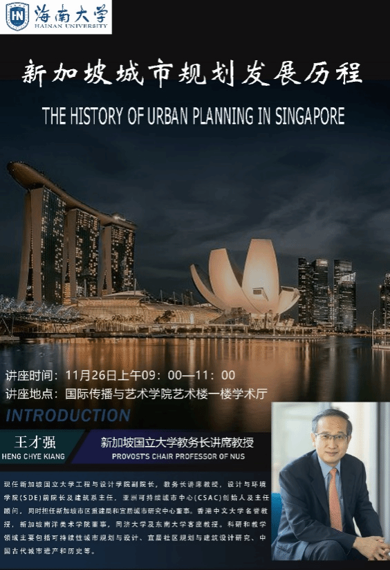 11月26日上午9:00 ,应新葡的京集团8814邀请,新加坡国立大学教务长讲席教授、新加坡南洋美术学院董事、亚洲可持续城市中心创始人及主任顾问王才强(HENG CHYE KIANG)教授,在艺术楼学术厅开展以 “新加坡城市规划发展历程”为主题的学术讲座。