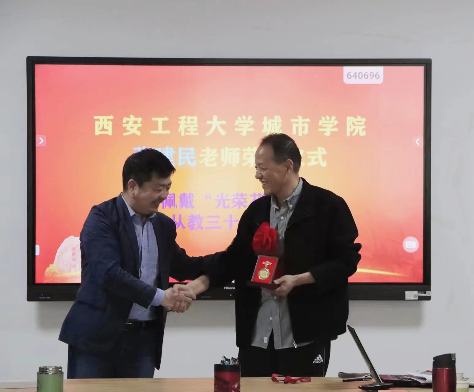 荣休仪式上,大家通过短视频形式一起回顾了张建民老师从教37年来的光荣历程,分布在全国各地的张建民老师的学生也纷纷以视频的形式向张老师送来了美好的祝福。学院党委书记王劲伟代表学院为张建民老师佩戴“光荣花”并颁发从教三十年荣誉奖章,学生代表刁佳琦向张老师献鲜花,学院工会主席宋经华老师代表学院向张建民老师赠送了纪念品。