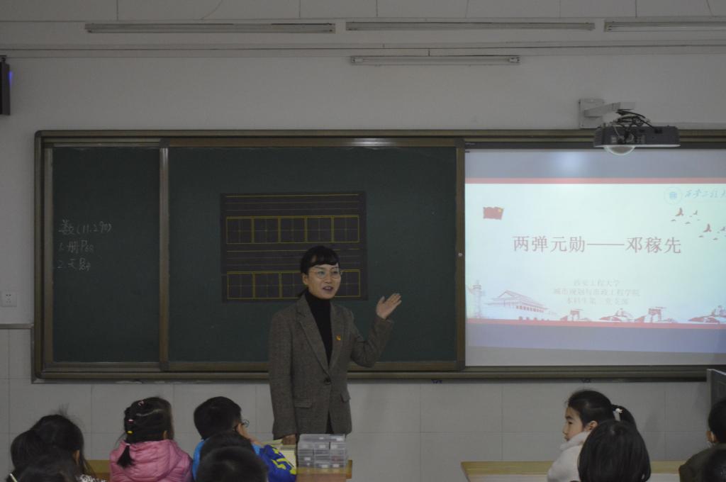 2019年11月29日下午,为贯彻落实 “不忘初心、牢记使命”主题教育精神,今年会学生第三党支部在西安市铁五小学为一年级的同学们开展了主题为“两弹元勋——邓稼先”的爱国教育课。参与活动的有:铁五小学一年级教师、学生以及今年会本科生第三党支部的学生党员。带队老师为本科生第三党支部书记张苹。