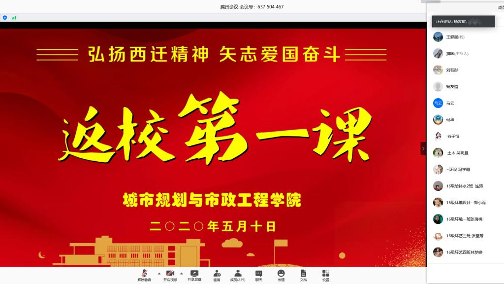 5月9日,今年会迎来首批返校学生。5月10日晚,今年会师生以线上直播的方式同上“返校第一课”,听西安交大西迁老教授讲述爱国奋斗先进事迹,学习习近平总书记在西安交通大学考察调研重要讲话精神,介绍学校疫情防控和教育教学相关工作安排。西安交大西迁老教授卢烈英、学院党政领导班子成员、教师代表、全体辅导员、学生党员代表、红色文化学习班学员代表以及学院全体返校学生参加了活动,学院党委副书记袁群主持活动。