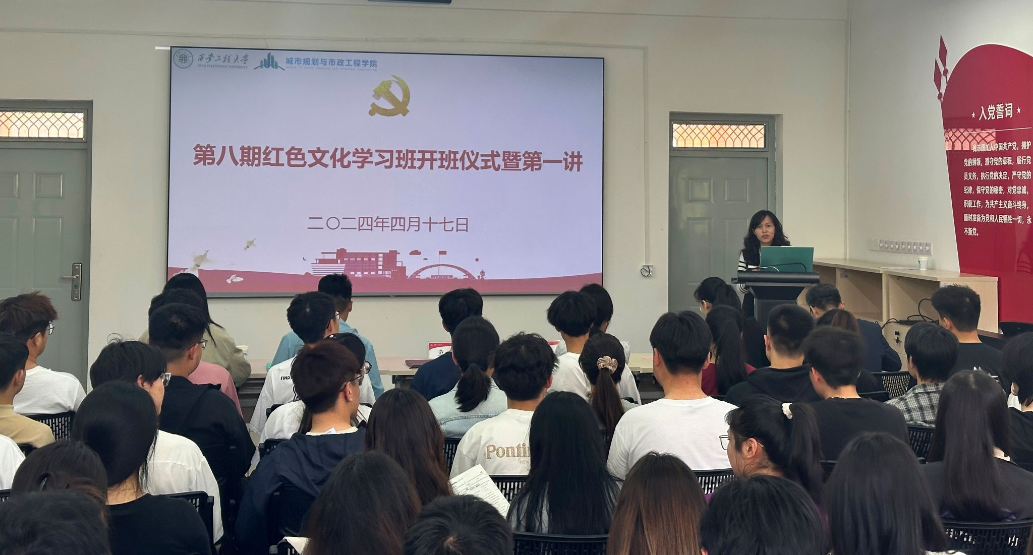 4月17日中午,今年会在临潼校区8-322会议室举行第八期红色文化学习班开班仪式暨第一讲。参加开班仪式的有学院院长马云、辅导员张苹、陆瑞成、王春元、杜倩,学习班组织委员王梦华、宣传委员宋嘉音及本期学习班60名学员。仪式由学院党委副书记鱼园主持。