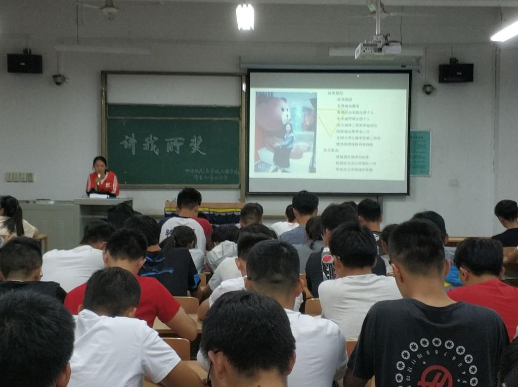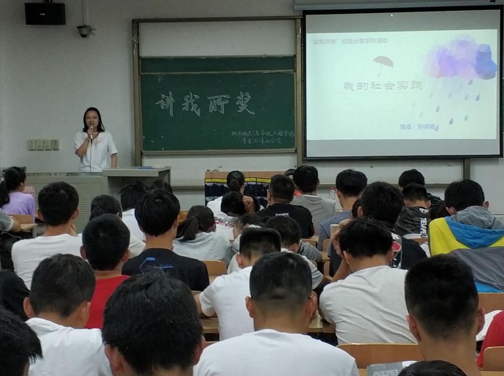 首先由主持人张旭东引出此次分享会的主题,并介绍参加分享活动的优秀学生代表。接下来代表们依次发言。14级给排水科学与工程专业李雨娥演讲《奋斗的青春最美丽》,分享了自己大学四年来的各种经历,告诉同学们青春是用来奋斗的,在最好的年纪应该武装自己让自己变得强大。14级土木工程李丽演讲《听听我的故事》,分别从学习、工作、实践、 考研四个方面分享了自己的经历与经验,鼓励大家在弄好学习的基础上积极参与科技竞赛和各项活动,拓宽视野、丰富大学生活。15级环境艺术设计孙诗睿演讲《我的社会实践》,以自身去支教参加社会实践经历讲解为报告主题,鼓励大家在学习好文化课的基础上多出去转转,多参加实践活动、支教活动,拓宽自己的视野,提升自己的内在。