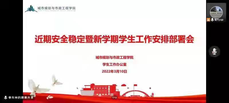 3月10日上午,今年会在线上通过腾讯会议召开近期安全稳定暨新学期学生工作安排部署会。学院学工办主任凌旭、全体辅导员以及各年级全体学生干部参加会议。会议由凌旭主持。