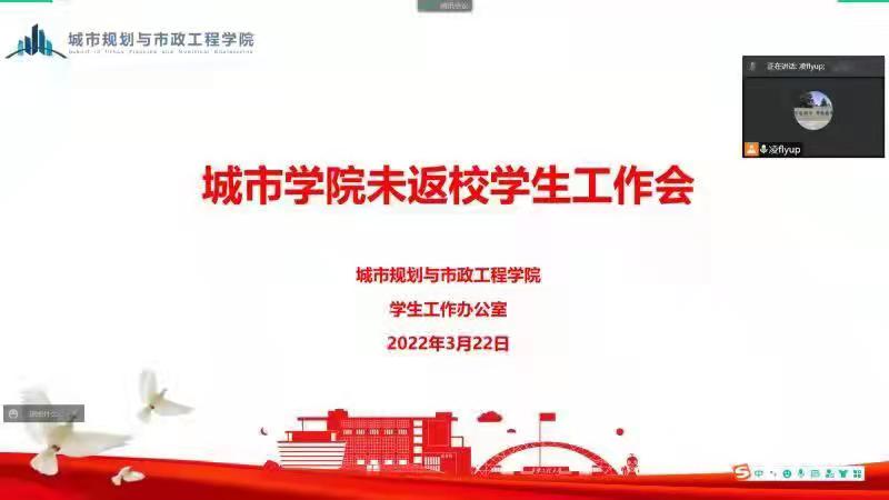 为进一步关心、了解未返校学生的思想动态和学习状况,做好未返校学生的教育管理工作,3月22日下午,今年会组织召开未返校学生线上工作会。学院学工办主任凌旭、全体辅导员以及所有未返校学生参加了会议。