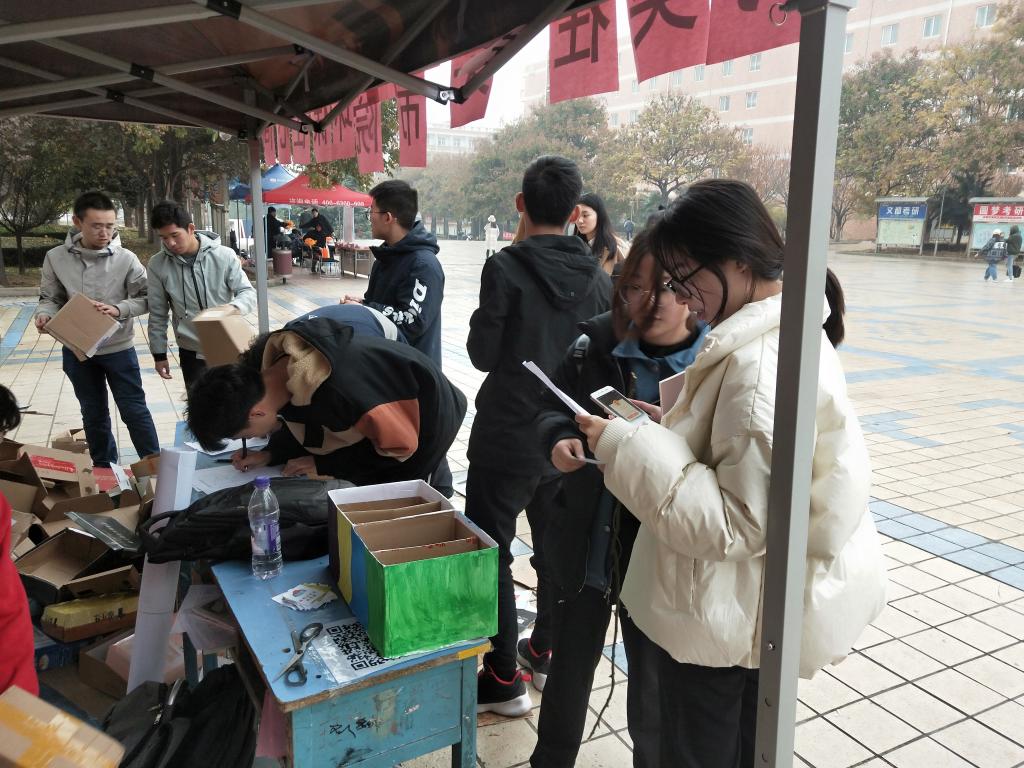 11月17日晚21:10分进行了活动场地的布置,做好活动前的准备工作。11月18日早上7:30分值班干事早早到达中心广场准备值班,其余干事到达活动室进行活动工具的准备,确保活动的顺利进行。早上8:00活动正式开始,参与活动的人也随之来到现场,参与者手带几个纸箱,值班人员进行了热心接待。活动期间,在同学们上课时段,有三个工作人员负责每轮的值班工作。一人负责接待参与活动的同学,向来了解活动的同学们介绍我们的活动内容里参与方式同时负责开展小游戏,一人负责登记同学的个人信息及交纸箱的个数,还有一个整理纸箱的工作人员。中午12:00是我们活动的高峰期,同学们大都会在这个时间段来参与活动。此时中心广场排起了长长的队伍,大家都来积极的参与我们的活动,可见大家都十分的重视垃圾的回收与分类。活动不仅仅是纸箱的收集,同时参与者积极参与垃圾分类的游戏,活动组织人员向大家讲明规则,30秒内将印有垃圾图标的卡片分至对应“垃圾桶”,且正确率达到80%的同学可以获得我们精心准备的两盆多肉植物作为奖励。活动时间持续3天,今年会青分队和参与者的积极宣传,使得近乎一千五百人参与到活动中。活动进行到20日17:00已近乎尾声了,青分队无课干事于17:00到达中心广场,将收集到的纸箱进行整理并将完好的纸箱交由快递公司二次利用,无法利用的纸箱,我们联系了废品回收机构,交由废品机构进行统一处理,并将收益用于之后今年会志愿服务基地的联络创建。