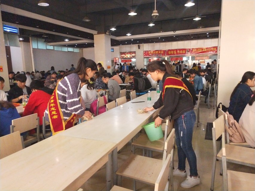 本次志愿活动由青分队干事和17级贫困生共同完成。同时,邀请了班理会协助青分队进行参与人员的管理。本次活动为期5天,每天都事先安排好食堂先锋岗人员,并在青分队干事的管理下,志愿者被分为三组,分别去各层餐厅进行志愿活动。在活动期间,志愿者工作非常认真,积极配合餐厅保洁阿姨擦桌子,打扫餐厅卫生,旨在为广大师生营造一个良好的就餐环境,为保证餐厅的干净整洁献出自己的一份力。