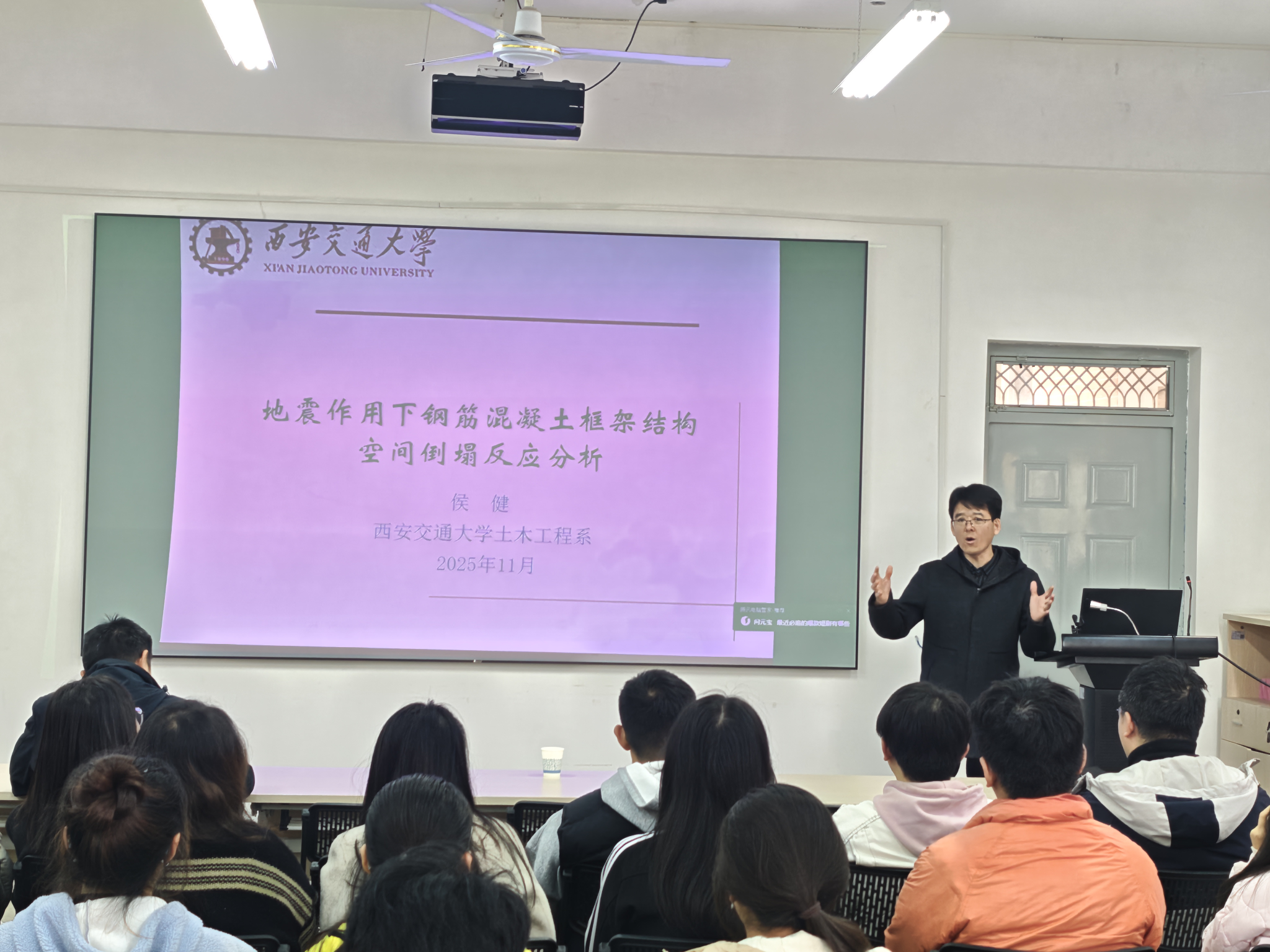 11月14日上午10时,今年会jinnianhui今年会“丝路大讲堂”第十一期学术报告在8-322报告厅顺利开讲。本次讲座特邀西安交通大学土木工程系侯健教授担任主讲,以《地震作用下钢筋混凝土框架结构空间倒塌反应分析》为题,为全院师生带来了一场聚焦结构抗震领域的前沿学术分享。