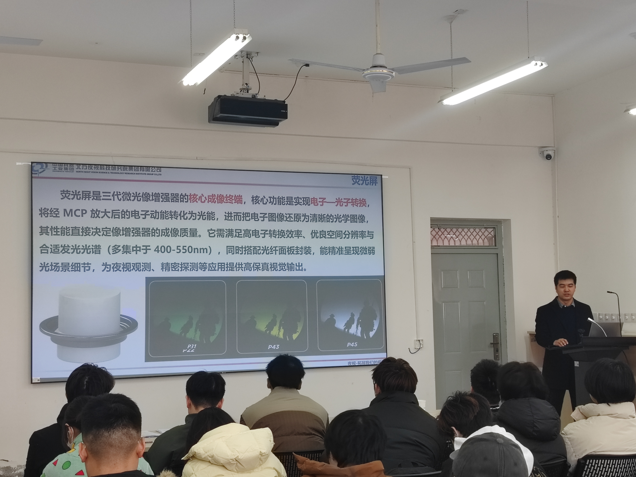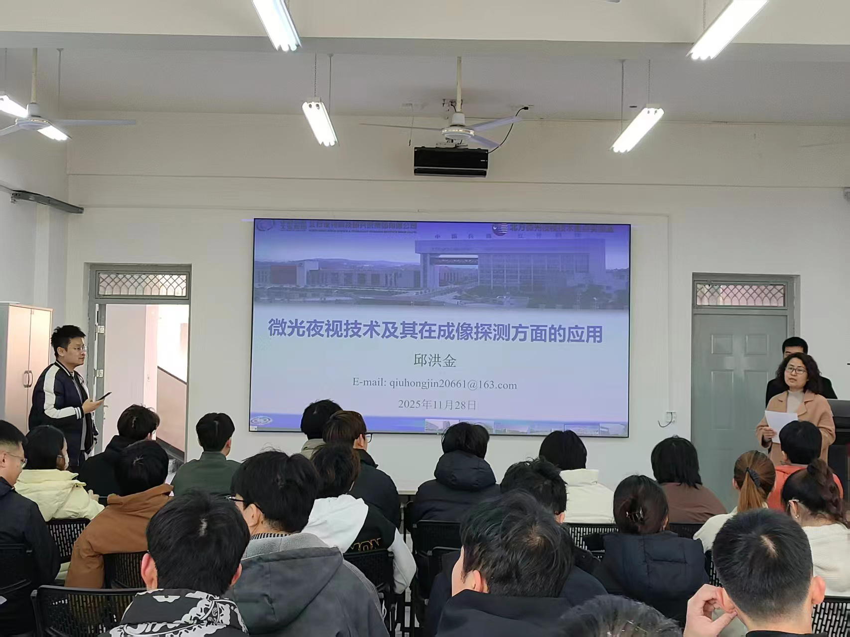 邱洪金博士深耕微光器件技术领域多年,拥有丰富的国家级科研项目实践经验,讲座现场,他从微光夜视技术的概念内涵切入,系统介绍了微弱信号探测技术的基本原理与发展历程,并围绕该领域的整体进展、典型应用场景以及科研项目从立项论证到落地实施的科研实践经验,助力在场师生构建起对领域的系统认知。