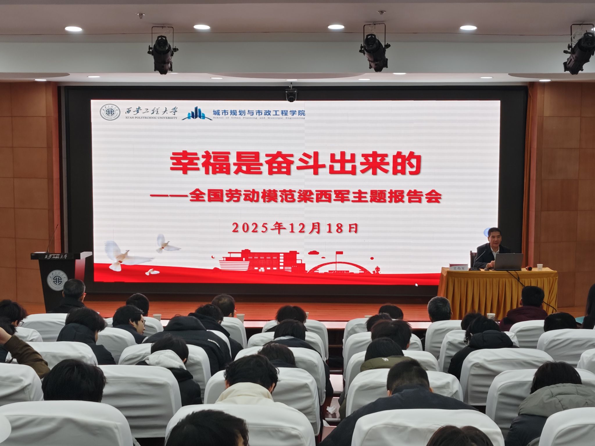 报告会上,梁西军结合自身学习、工作经历,从“时代召唤与个人理想”、“学无止境的追求”、“心怀感恩的修养”以及“实践磨砺的担当”等多个维度,深刻诠释了“幸福是奋斗出来的”。他勉励同学们,要珍惜在校学习的宝贵时光,夯实专业基础,锤炼过硬本领,将“小我”融入国家发展和民族复兴的“大我”之中。牢记“幸福是奋斗出来的”,用汗水浇灌梦想,用奋斗书写青春,在未来祖国广袤的土地上,铸就属于自己的光荣与梦想!