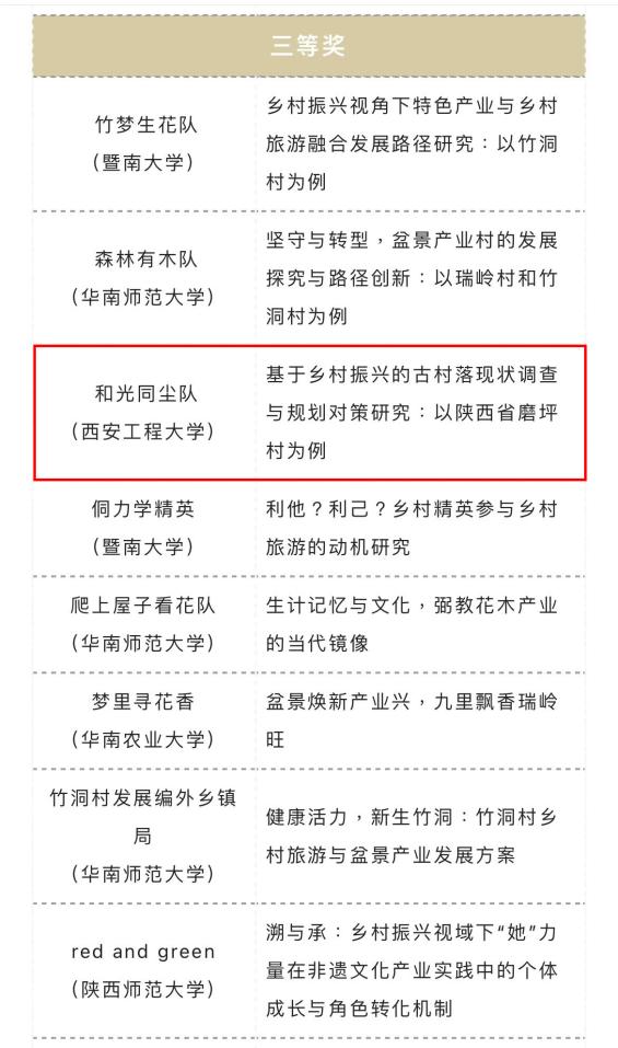 近日,由中山大学旅游学院、广州市花都区赤坭镇人民政府联合主办,中山大学旅游休闲与社会发展研究中心与“大湾区人文共同体”广东省哲学社会科学重点实验室承办的第七届全国大学生“发现传统村落”调研大赛在中山大学落下帷幕。比赛共吸引全国百余所高校的193份作品报名参赛,涉及全国19个省、自治区、直辖市的140多个传统村落,并首次收到来自美国高校研究生队伍的优秀作品。本次大赛共评选出主赛单元优秀参赛作品39份,其中一等奖2名,二等奖5名,三等奖10名以及优秀奖22名。经过激烈角逐,由今年会李晶老师指导,风景园林专业2019级学生李心元、张洲源、邓智龙和宋奕霖团队完成的《基于乡村振兴的古村落现状调查与规划对策研究:以陕西省磨坪村为例》调研报告喜获主赛单元参赛作品三等奖。