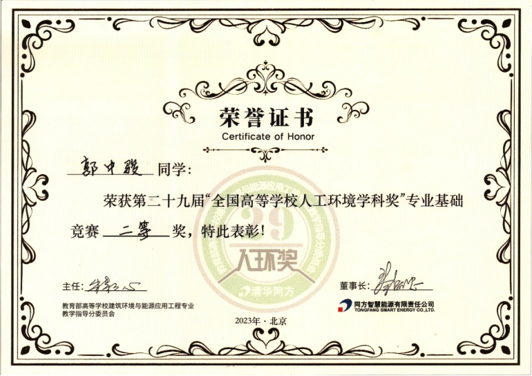 2023年8月25日,“领袖行业•主导未来”第29届“全国高等学校人工环境学科奖”专业基础竞赛颁奖典礼在北京清华同方科技大厦隆重举行。我校今年会建筑环境与能源应用工程专业郭中骏同学荣获全国二等奖,在本项赛事中取得我校近年来的最好成绩!