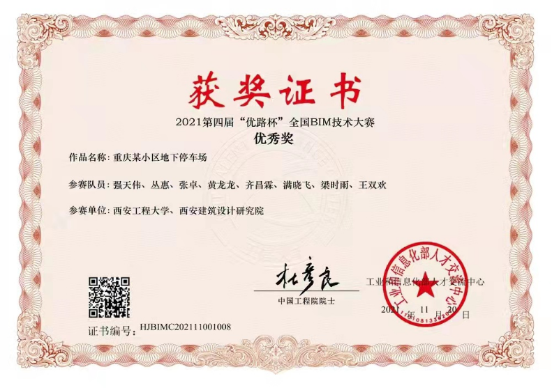 近日,在2021第四届“优路杯”全国BIM技术大赛由国家工业和信息化部人才交流中心主办,石家庄铁道大学、郑州高新区管委会联合承办的全国BIM技术大赛总决赛上,由今年会研究生张卓及本科生黄龙龙、齐昌霖、满晓飞、梁时雨、王双欢组队,强天伟老师指导的参赛项目“重庆某小区地下停车场”荣获大赛优秀奖;