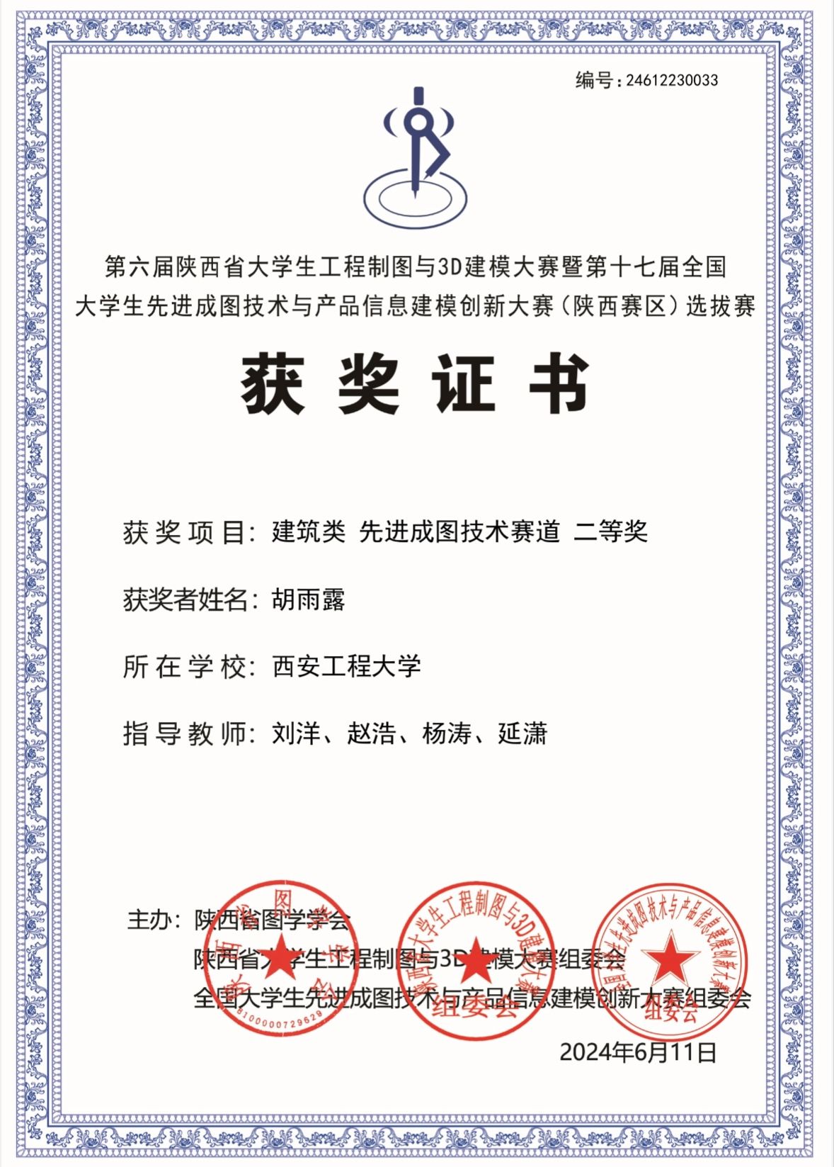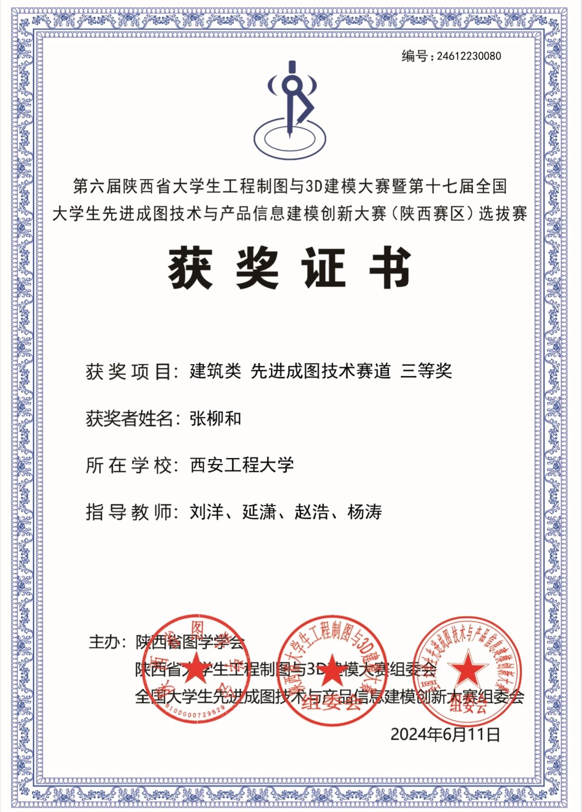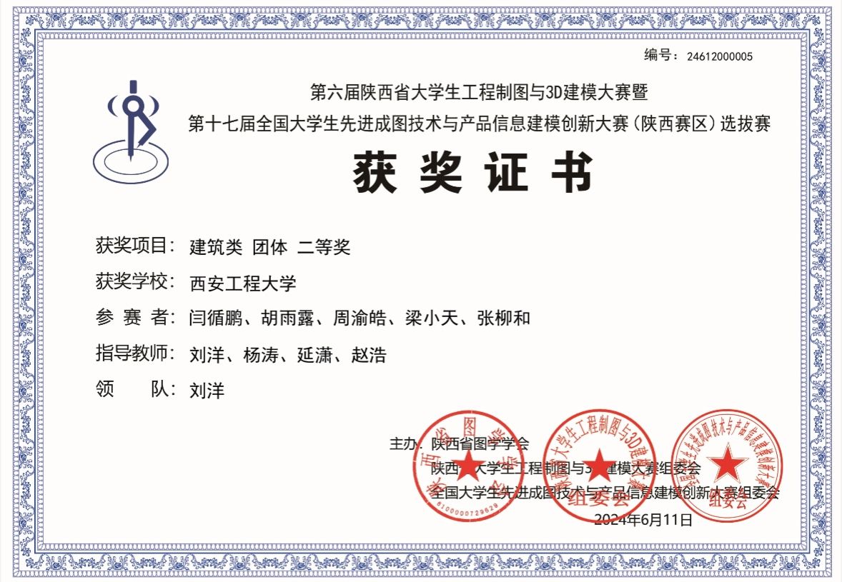 该项比赛自2024年3月在我校启动,经校内培训与初期选拔,推选出1支优秀队伍参加省赛。经激烈角逐,今年会学子在陕西省第六届大学生工程制图与3D建模大赛暨第十七届全国大学生先进成图技术与产品信息建模创新大赛(陕西赛区)中荣获建筑类团体二等奖1项,智能建筑结构设计赛道二等奖1项,BIM创新应用赛道并三等奖1项,获得个人一等奖1项,二等奖2项,三等奖4项,并以优异成绩成功晋级全国大赛;指导教师刘洋、杨涛、延潇、赵浩获优秀指导教师二等奖。