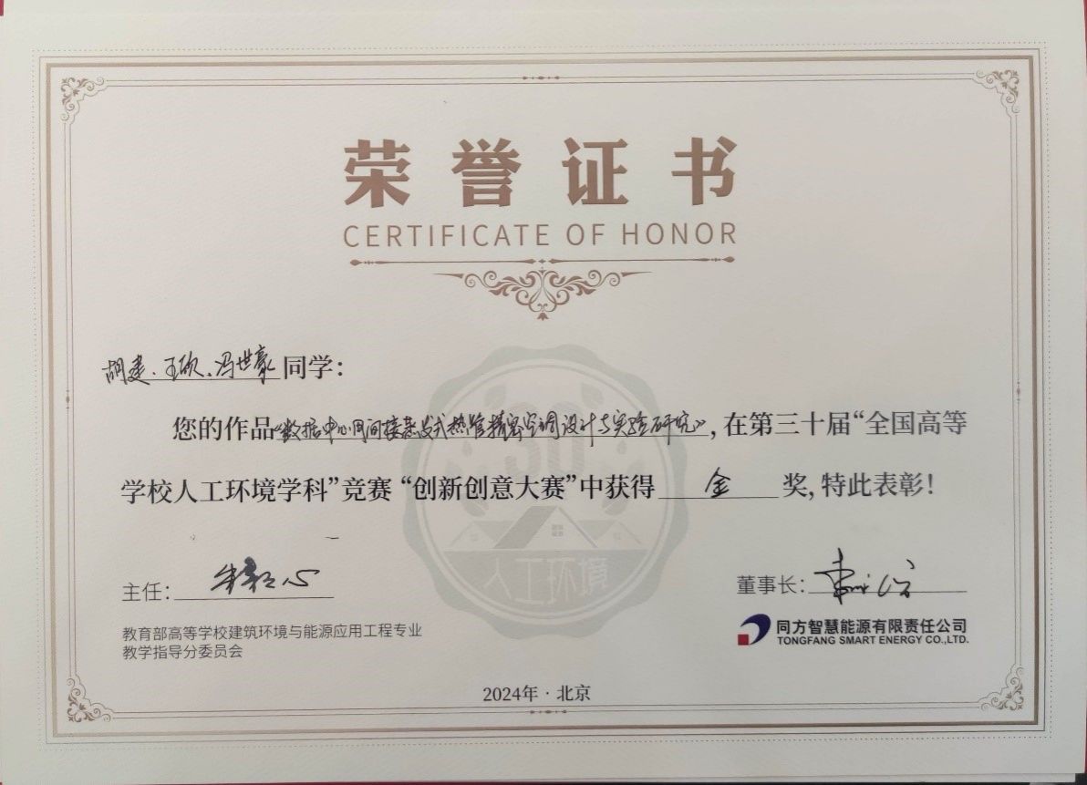 本次竞赛由教育部高等学校建筑环境与能源应用工程专业教学指导分委员会主办,同方智慧能源有限公司赞助。大赛以“领袖行业,主导未来”为主题,旨在激励青年学生奋发进取,引导全国建环专业的基础理论课程教学质量提高,促进我国人工环境行业发展进步。入围本次研究生组决赛答辩的作品共5个,评审专家对参赛作品进行了认真审评,从原创性、创新性、可行性、经济性、适用性等多维度进行打分,答辩过程与答辩结果公开透明。最终评选结果为:金奖2位,银奖3位。我校今年会2022级研究生胡建、王欣、2023级研究生冯世豪参加了本次竞赛,在黄翔教授、褚俊杰老师的指导下凭借作品《数据中心用间接蒸发式热管精密空调设计与实验研究》名列决赛第1名,荣获研究生组金奖。