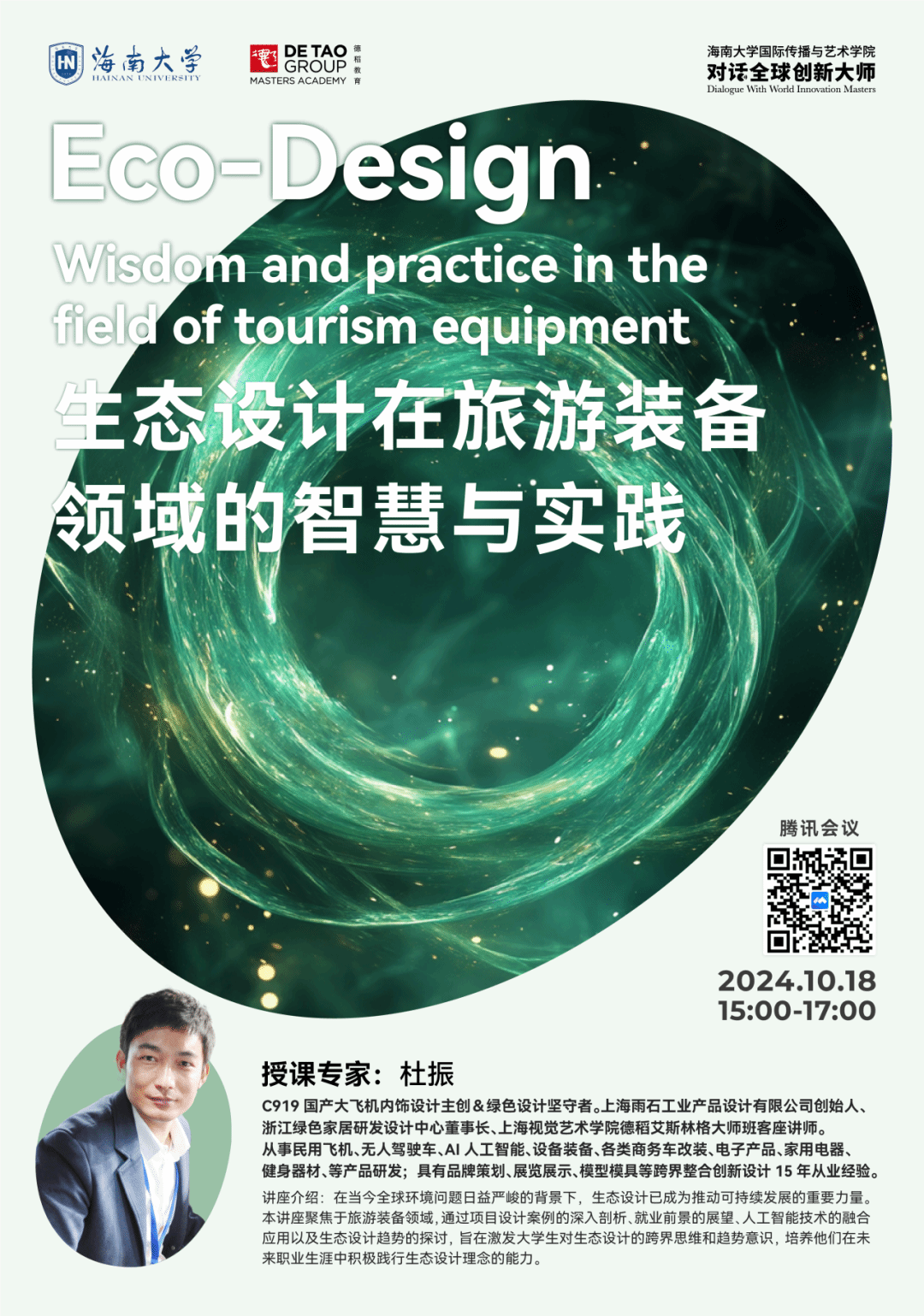 10月18日15:00,新葡的京集团88142024“对话全球创新大师讲座”《生态设计在旅游装备领域的智慧与实践》在线上举行,由上海雨石工业产品设计有限公司创始人杜振主讲,设计系专业教师方星星博士担任学术主持,线上线下近百名师生同时参与。