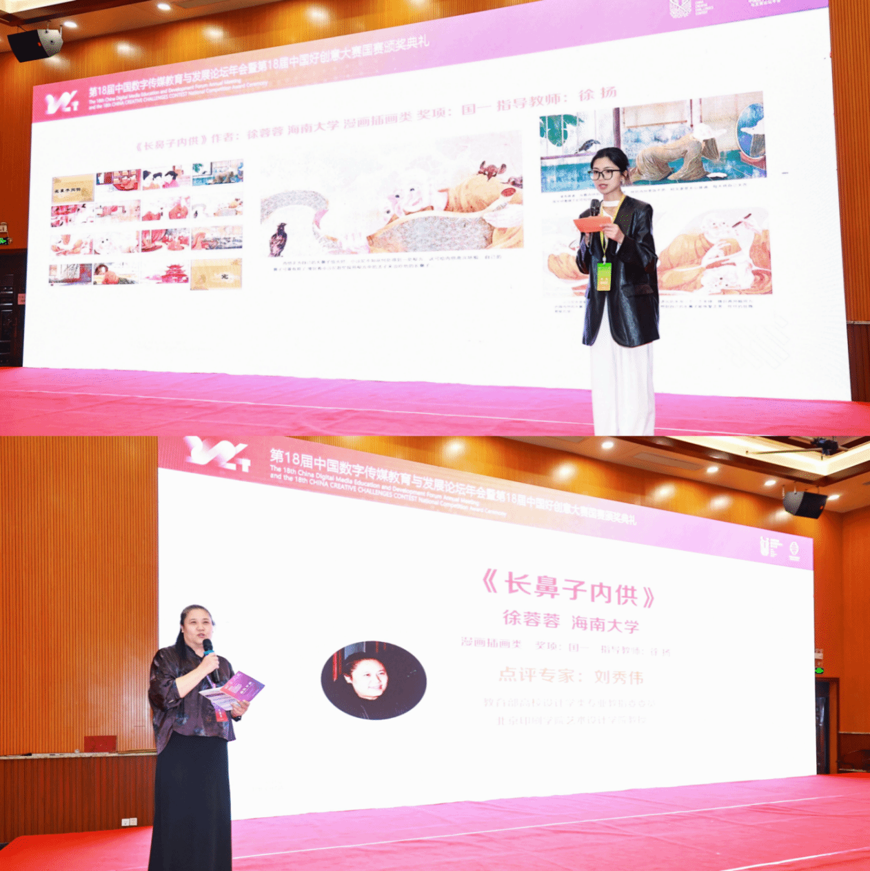 新葡京官网学生徐蓉蓉荣获国赛一等奖,并作为获奖嘉宾邀请上台进行作品创作分享。教育部高校设计学专业教指委委员、北京印刷学院艺术设计学院教授刘秀伟现场点评认为:这部插画作品在艺术风格、主题表达、技术手法、情感传达以及文化内涵等多个方面都表现出色,是一次成功的艺术创作实践。