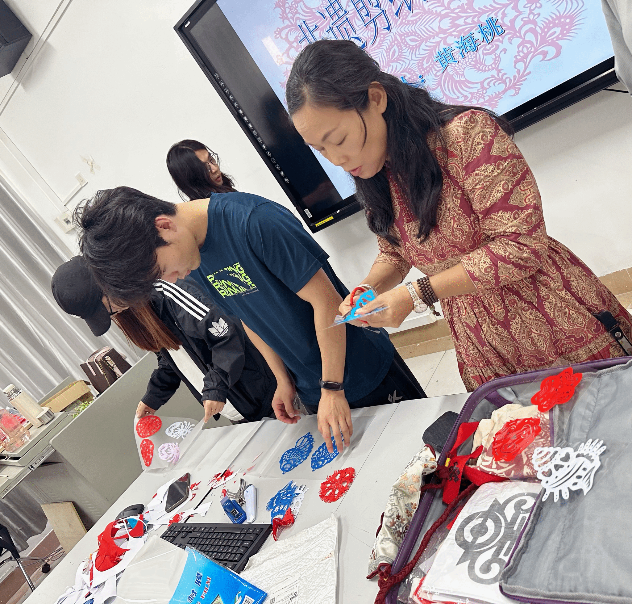 课堂上,黄海桃老师首先结合相关政策介绍,让同学们认识到剪纸艺术及中华优秀传统文化的重要性。接着从剪纸的起源与发展切入进行阐述,阐明了剪纸不仅是世界级非遗,更是中华民族共同体的符号象征。黄老师结合自己的作品和人生经历,分析了传统纹样的文化逻辑与象征寓意,着重讲述了她的作品对海南黎族图腾、热带植被及海洋文化等特色地域元素的融入方式。