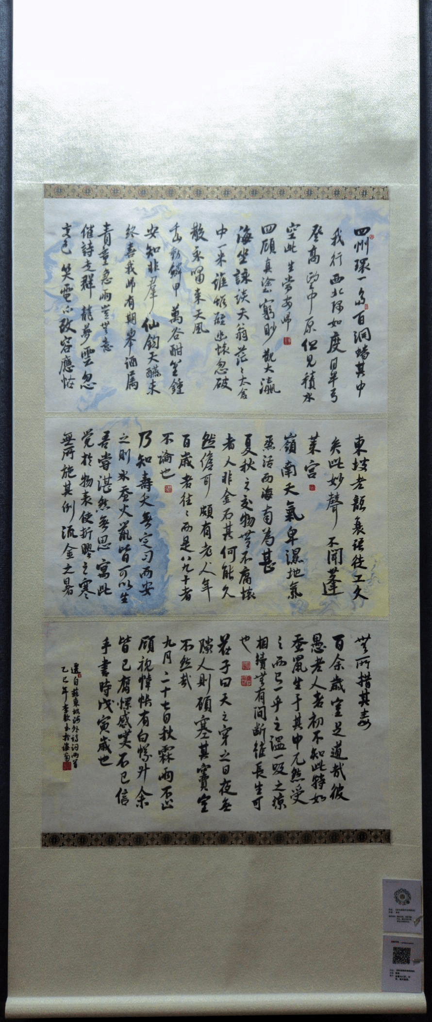 符宣国书记听取了参展师生对作品构思、技法的讲解,对学生的艺术创造力表示肯定,并强调书法学习必须扎根传统,在深入研习古代名家作品的过程中,逐步形成个人风格;同时要注重古典文学修养,多书写古诗词等传统经典内容,提升作品的文化内涵。