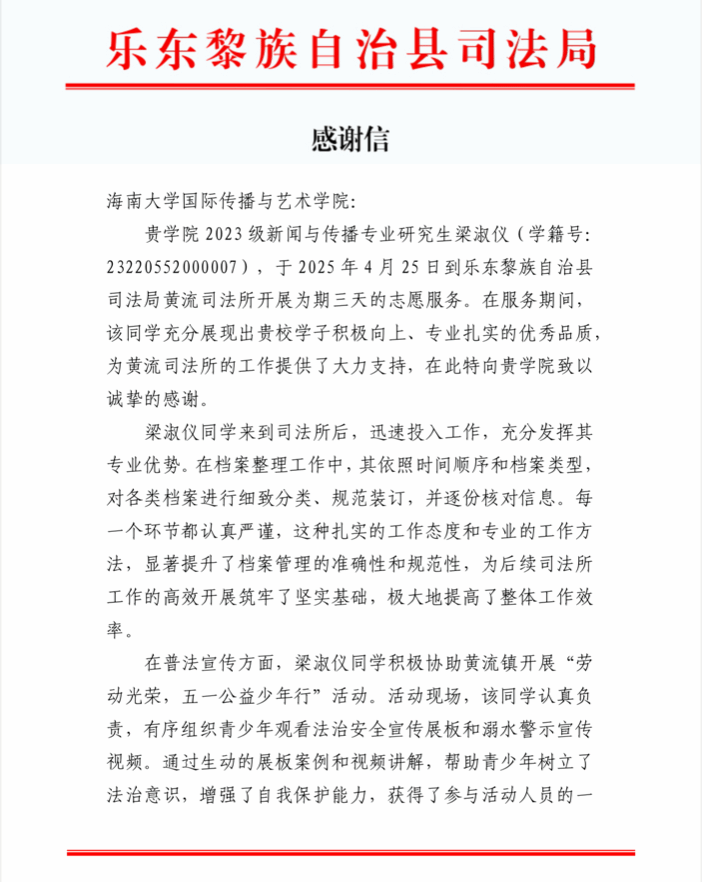 近日,乐东黎族自治县司法局向新葡京官网发来感谢信,对2023级新闻与传播专业研究生梁淑仪同学在黄流司法所开展的高质量志愿服务表示感谢。