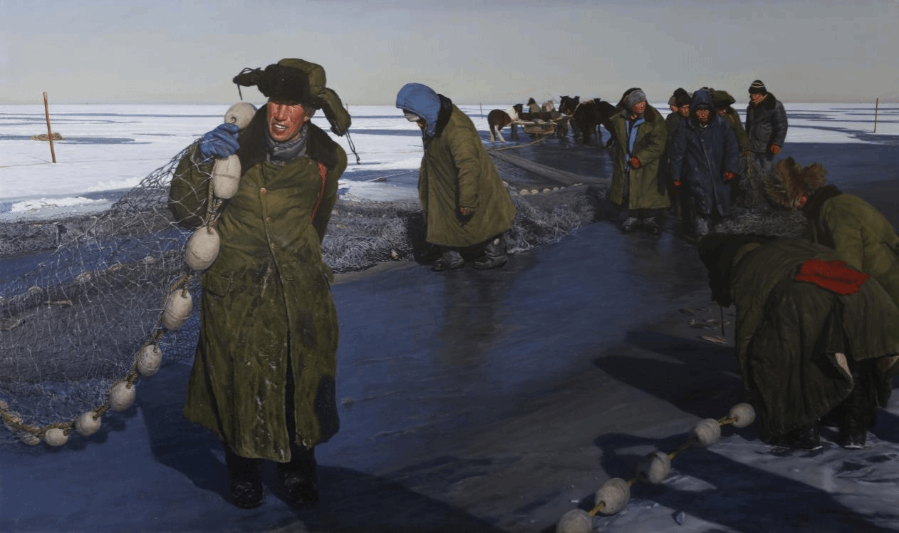 李澎霖《查干湖冬捕之十里冰湖渔猎风》 布面油画 188x114cm 2024年