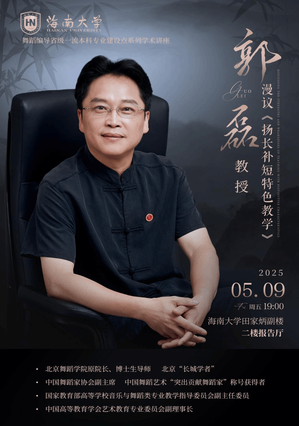 5月9日19:00,新葡京官网舞蹈系举办舞蹈编导省级一流本科专业建设点系列学术讲座——《扬长补短特色教学》,特邀北京舞蹈学院原院长、博士生导师郭磊教授主讲。活动由舞蹈系教师杨小强主持。