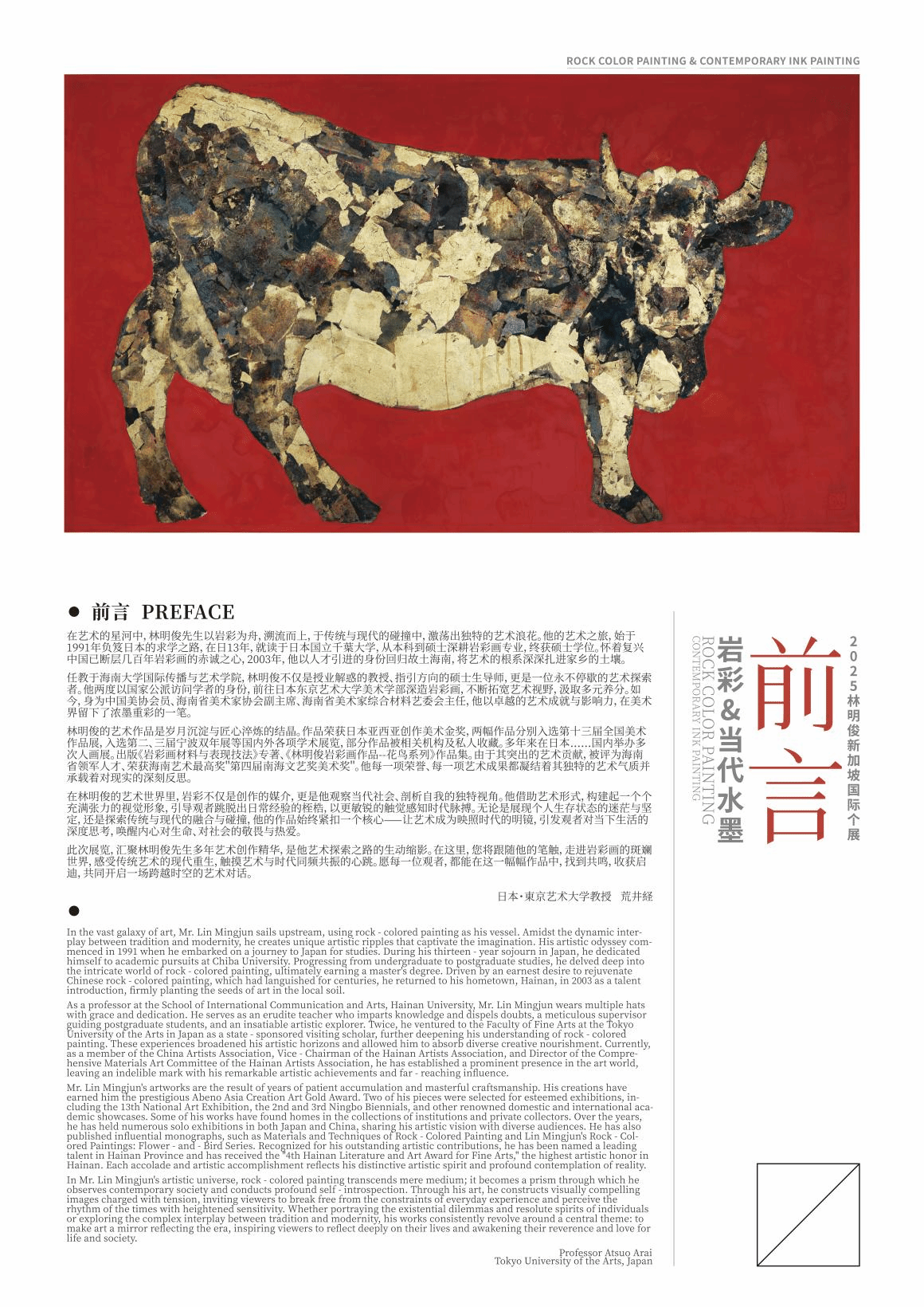 2025年6月1日至8日,新葡京官网美术系林明俊教授国际个展《岩彩丹青——岩彩&当代水墨》,将在新加坡若轩艺术展示空间开展。