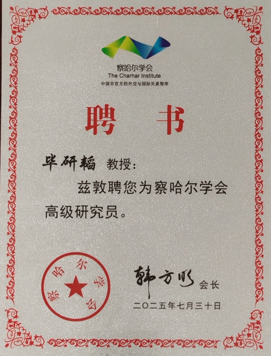 近日,新葡京官网传播学系毕研韬教授受聘为察哈尔学会高级研究员。