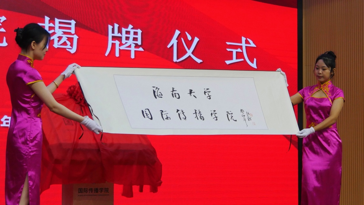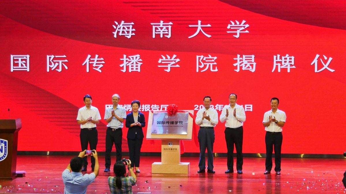 海南省委宣传部副部长蒋建民,海南省教育厅党委书记曹献坤,新华社海南分社社长陈良杰,新葡的京集团8814党委书记符宣国,党委常委和校领导高佃恭、韩淑梅、谭勇出席,国际传播学院全体师生参加揭牌仪式。
