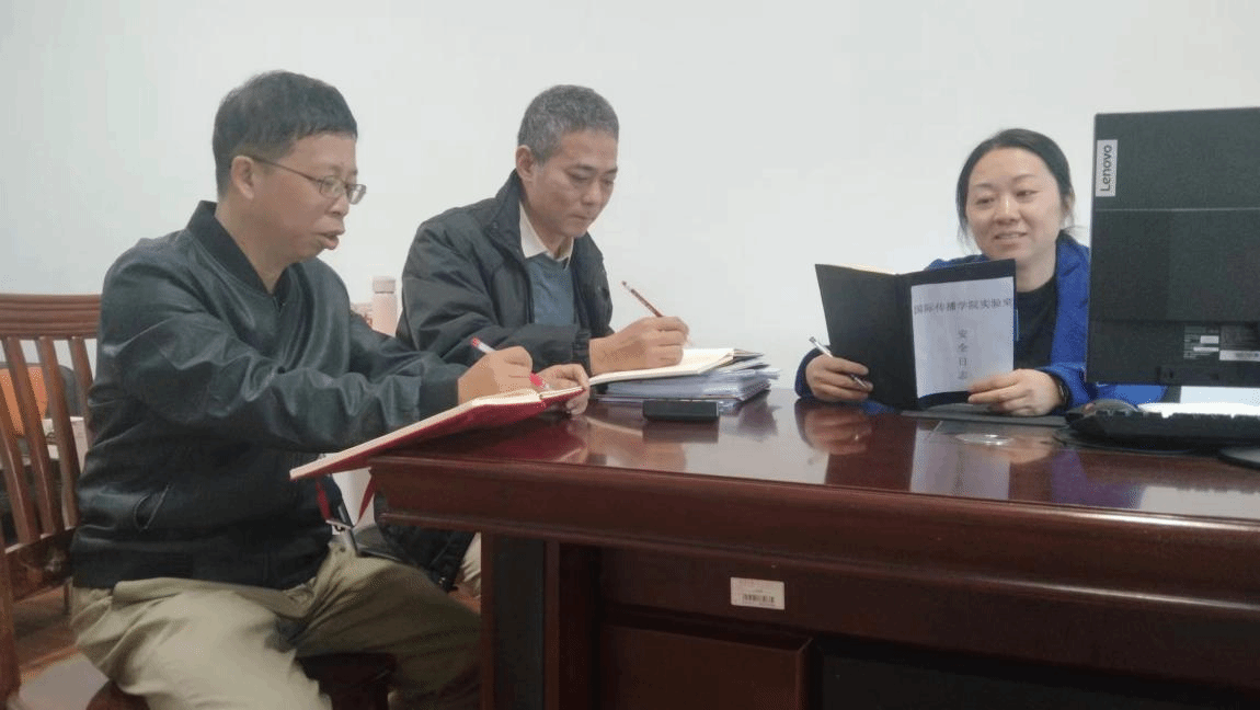 图为国际传播学院党总支书记谢辉凡查阅实验室安全日志