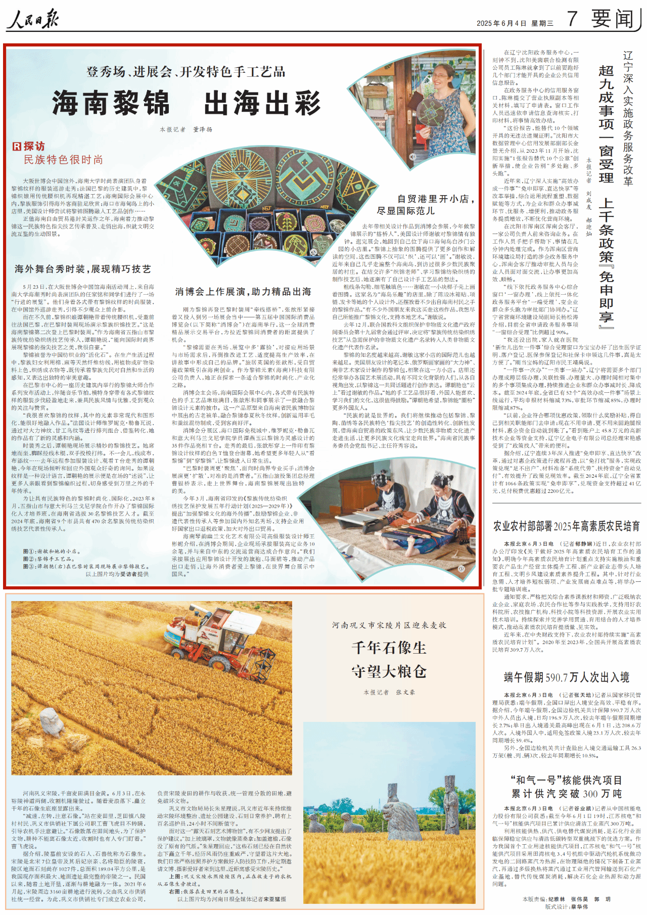 “民族的就是世界的。我们将继续推动包括黎锦、黎陶、苗绣等各民族特色‘指尖技艺’的创造性转化、创新性发展,借海南自贸港的政策东风,让少数民族非物质文化遗产走进生活,让更多民族文化瑰宝走向世界。”海南省民族事务委员会党组书记、主任符秀容说。
